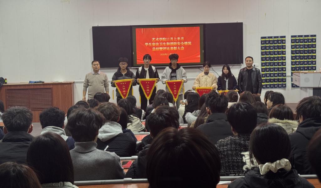 会上,宣读了艺术学院文明宿舍创建活动实施方案,通报了艺术学院11月上半月学生宿舍卫生和消防安全情况,并为评选出的5个文明宿舍进行表彰授旗。
